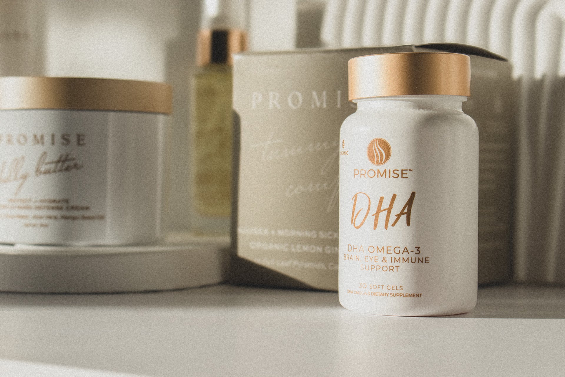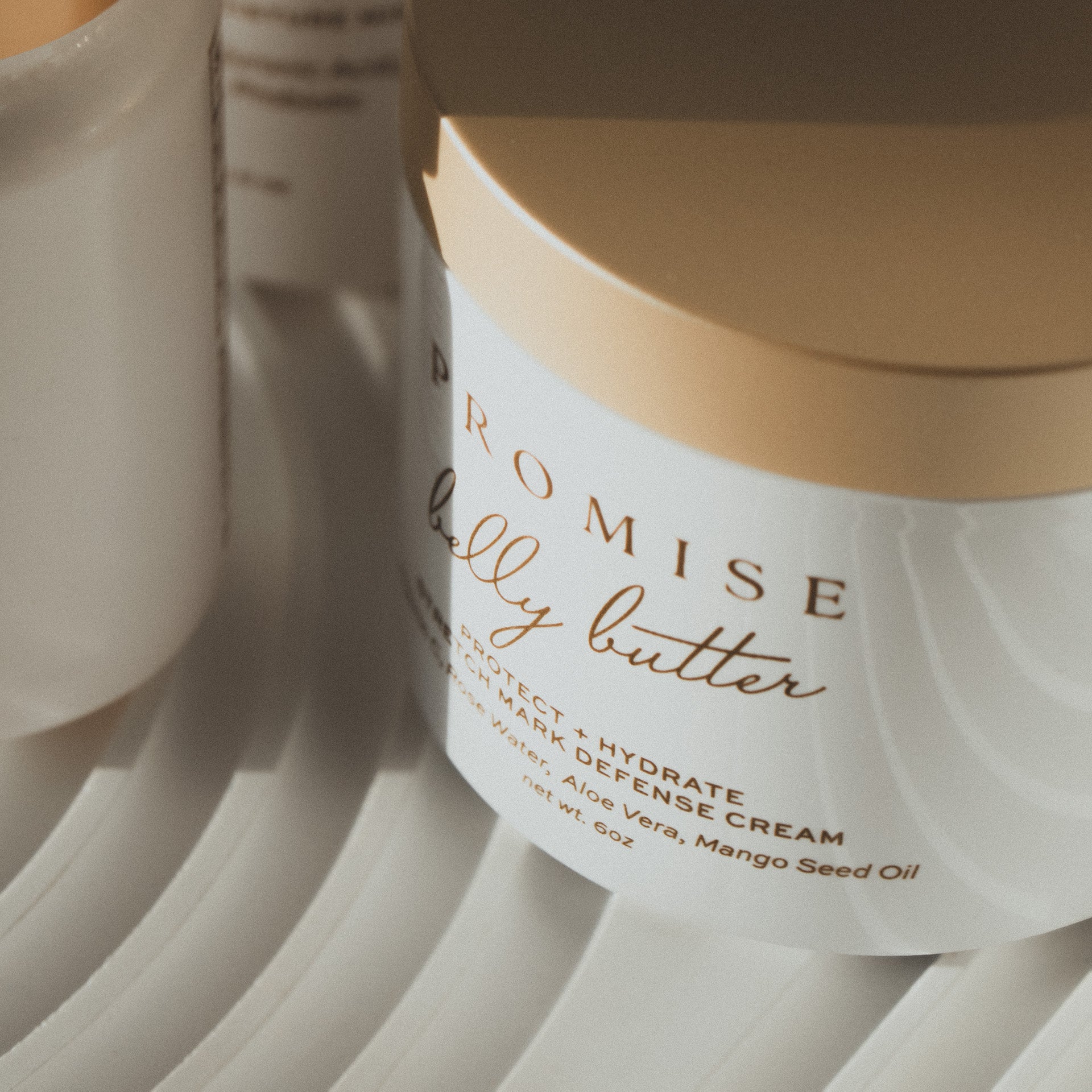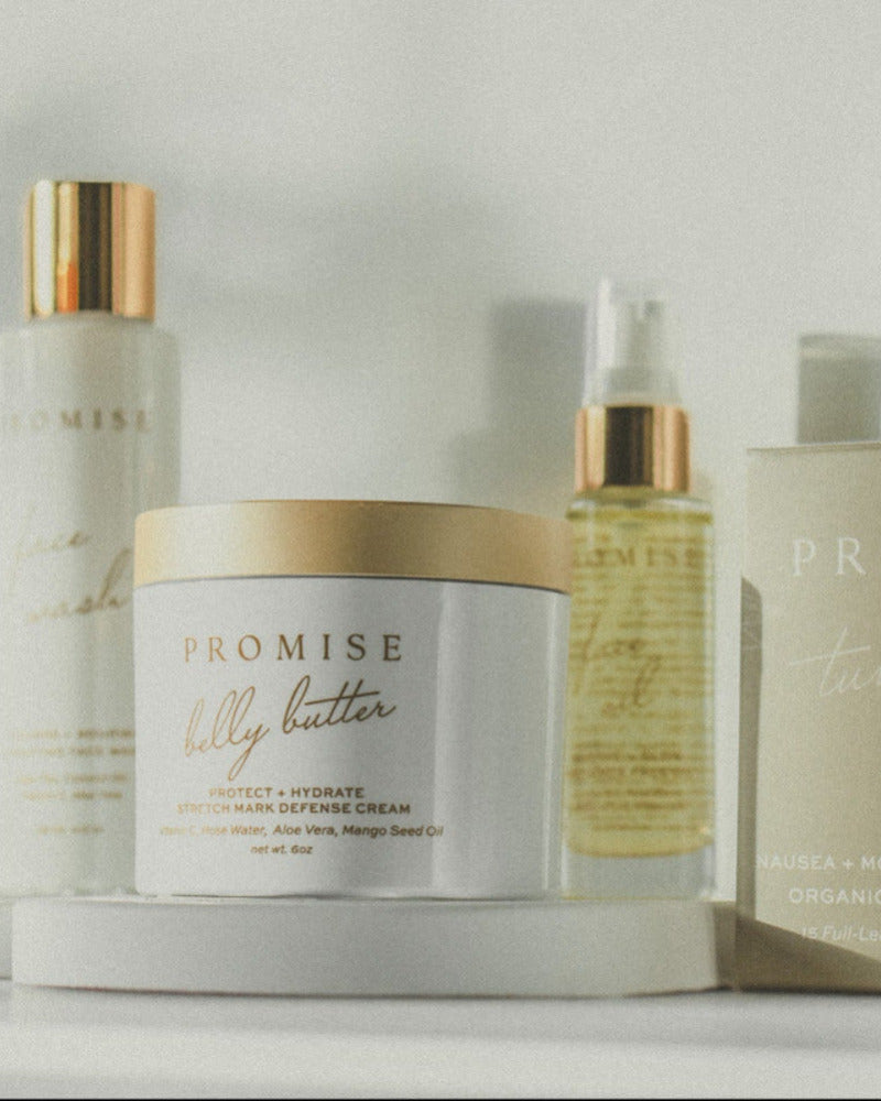 Promise Belly Butter – A decadent fusion of vitamin C, organic shea, coconut, mango, and cocoa butters, aloe leaf extract, and organic botanicals including sweet orange peel, rose, and lavender to deeply nourish, soften, and pamper your skin.